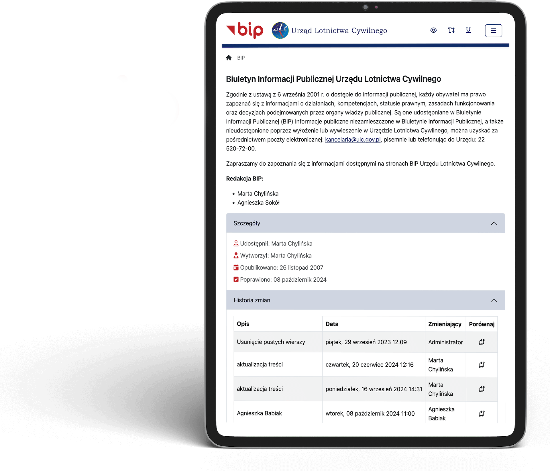 Strona internetowa Urzędu Lotnictwa Cywilnego została zaprojektowana i wdrożona zgodnie z wytycznymi WCAG 2.1 (Web Content Accessibility Guidelines) na poziomie AA, zapewniając pełną dostępność cyfrową dla osób z niepełnosprawnościami. Oznacza to, że serwis spełnia szereg wymagań w zakresie kontrastu kolorów, czytelności tekstu, nawigacji klawiaturą, opisów alternatywnych dla grafik oraz kompatybilności z czytnikami ekranu.